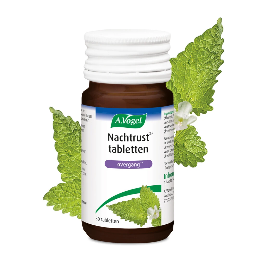 Overgang Famosan Slaap bij nachtzweten(1*) en lekker slapen(2*)Door hormoonschommelingen kun je te maken krijgen met overgangsverschijnselen zoals nachtzweten en periodes van stress. Dat kan van invloed zijn op je nachtrust. Ondersteuning tijdens de overgang kan helpen om lekker te slapen(2*). A.Vogel Overgang Famosan slaap (2*) bevat de planten citroenmelisse en saffraan, die helpen om te ontspannen(3*) en de plant Salvia die helpt bij nachtzweten(1*). Dat heeft weer een positieve invloed op le