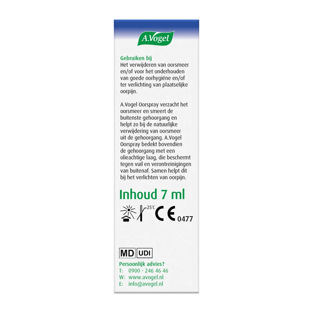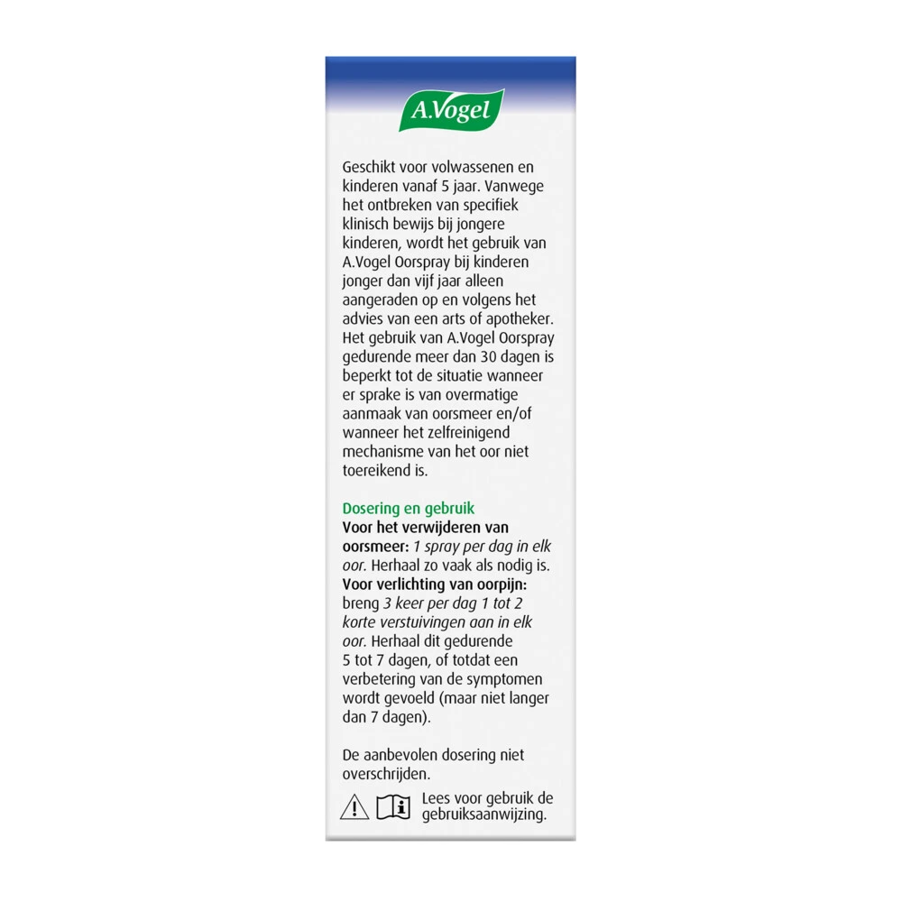 A.Vogel Oorspray Oorpijn Medisch hulpmiddel A. Vogel Oorspray Oorpijn verzacht het oorsmeer en smeert de buitenste gehoorgang en helpt zo bij de natuurlijke verwijdering van oorsmeer uit de gehoorgang. A.Vogel Oorspray bedekt de gehoorgang met een laagje olie om deze te beschermen tegen vuil en onzuiverheden van buitenaf. Samen helpt dit oorpijn te verlichten.Voor het verwijderen van oorsmeerVoor het onderhouden van goede oorhygiëneTer verlichting van plaatselijke oorpijnOp basis van o