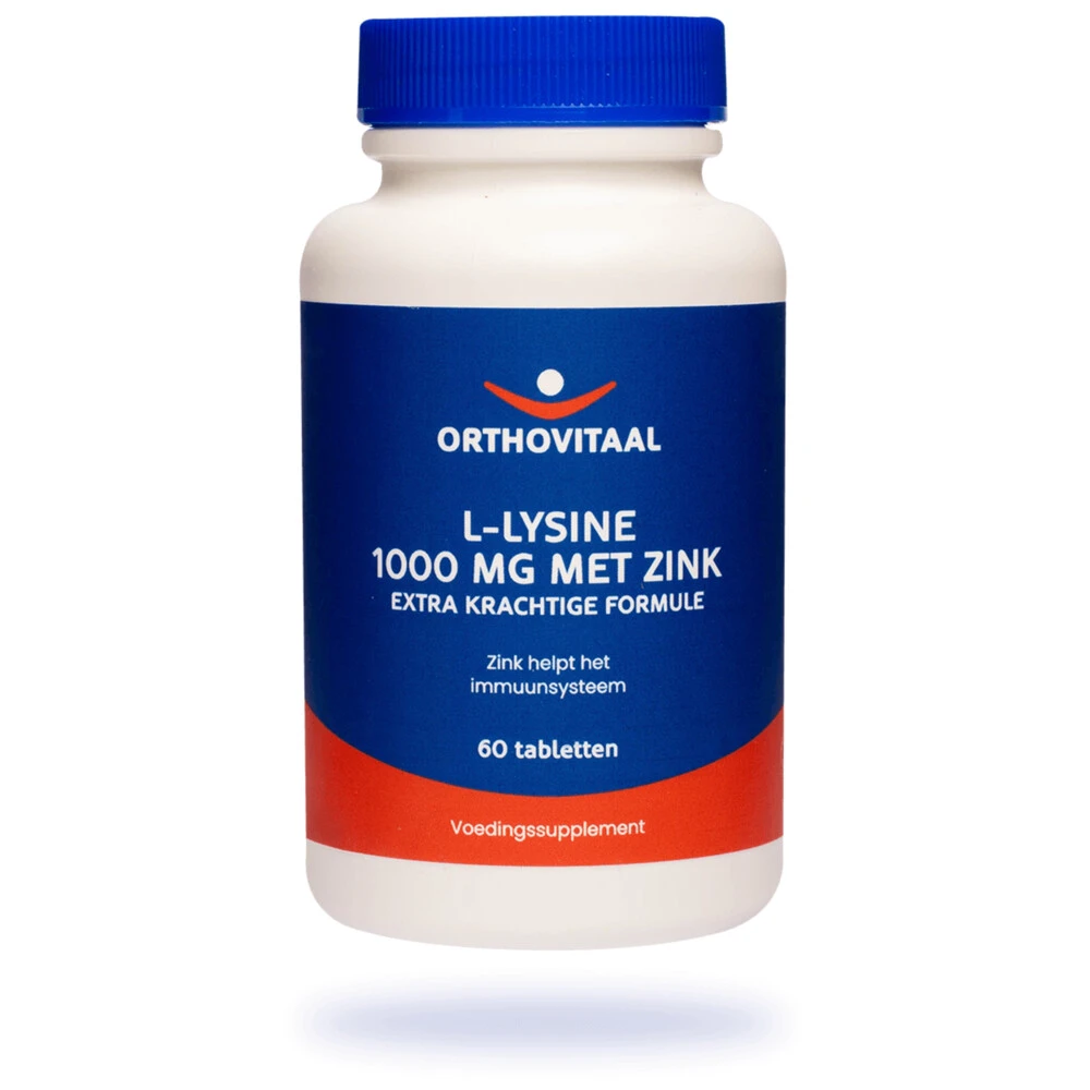 Orthovitaal L-Lysine 1000 mg met ZinkOrthovitaal L-Lysine 1000 mg met Zink ondersteunt de afweer van het lichaam en het herstellend vermogen van de huid. L-Lysine is een essentieel aminozuur, we kunnen zelf geen L-lysine aanmaken en krijgen dit via de voeding binnen. In de voeding komt L-lysine bijvoorbeeld voor in zuivel, vlees en peulvruchten. Daarnaast helpt zink bij de verzorging van de huid van binnenuit, draagt zink bij aan normale haargroei en draagt het bij aan het proces van cel vernieu