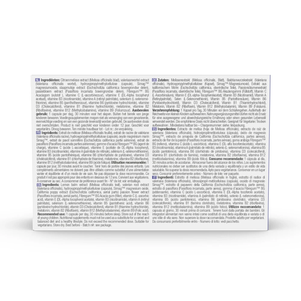 Purasana PuraSleepPurasana PuraSleep is en kruidencomplex dat speciaal is geformuleerd ter ondersteuning van de slaap en ontspanning. Naast valeriaan, passiebloem en citroenmelisse bevat het ook magnesium, vitamine B3, B9, B12 en C die bij dragen tot een normale werking van het zenuwstelsel en de psychologische functie.5-in-1 supplement met melatonineNatuurlijk slaapmiddel om beter te slapenValeriaan, passiebloem en citroenmelisse bevorderen de slaapMagnesium, vitamine B3, B9, B12 en C ondersteu