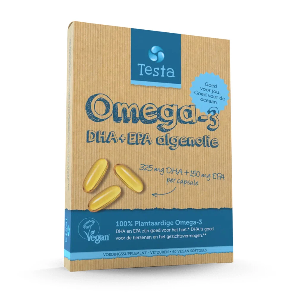 Testa plantaardig Omega-3 Testa Omega 3 van algenolie is een vegan omega-3 DHA+EPA Vetzurenpreparaat dat gegerandeerd visvrij is. Testa is zuiverder dan visolie en bedoeld om visolie te vervangen. Testa Omega 3 is geschikt voor vegetariërs en veganisten omdat het geen vis bevat. Naast de plantaardige ingrediënten worden de capsules gemaakt van zeewierextract. Testa Omega-3 bevat 450 mg Omega-3 vetzuren per capsule, waarvan minimaal 250 mg DHA en 125 mg